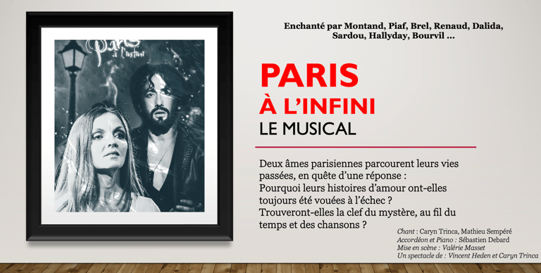 "Paris à l'infini" est un beau voyage à travers les époques. Il nous fait redécouvrir Paris, ses particularités, l'engouement inexpliqué pour cette ville au fil d'une histoire d'amour bien ficelée. On prend plaisir à revoir le répertoire de tant de chansons appréciées par tous et si bien enchaînées qu'on ne voit pas le temps défiler. On en ressort avec une seule envie: flâner dans la ville en chantonnant ! Le petit plus : un brin d'humour et la complicité du duo d'artistes."